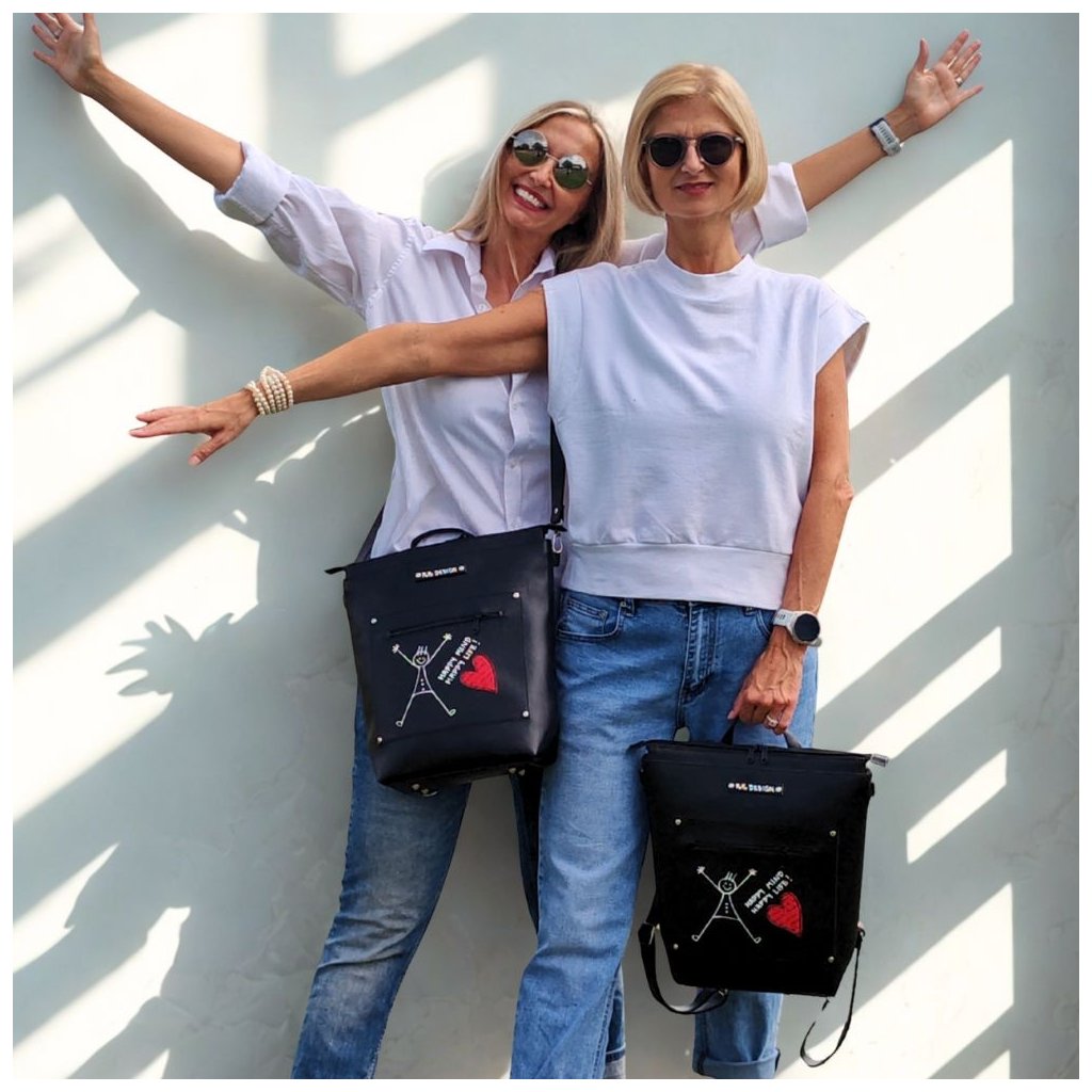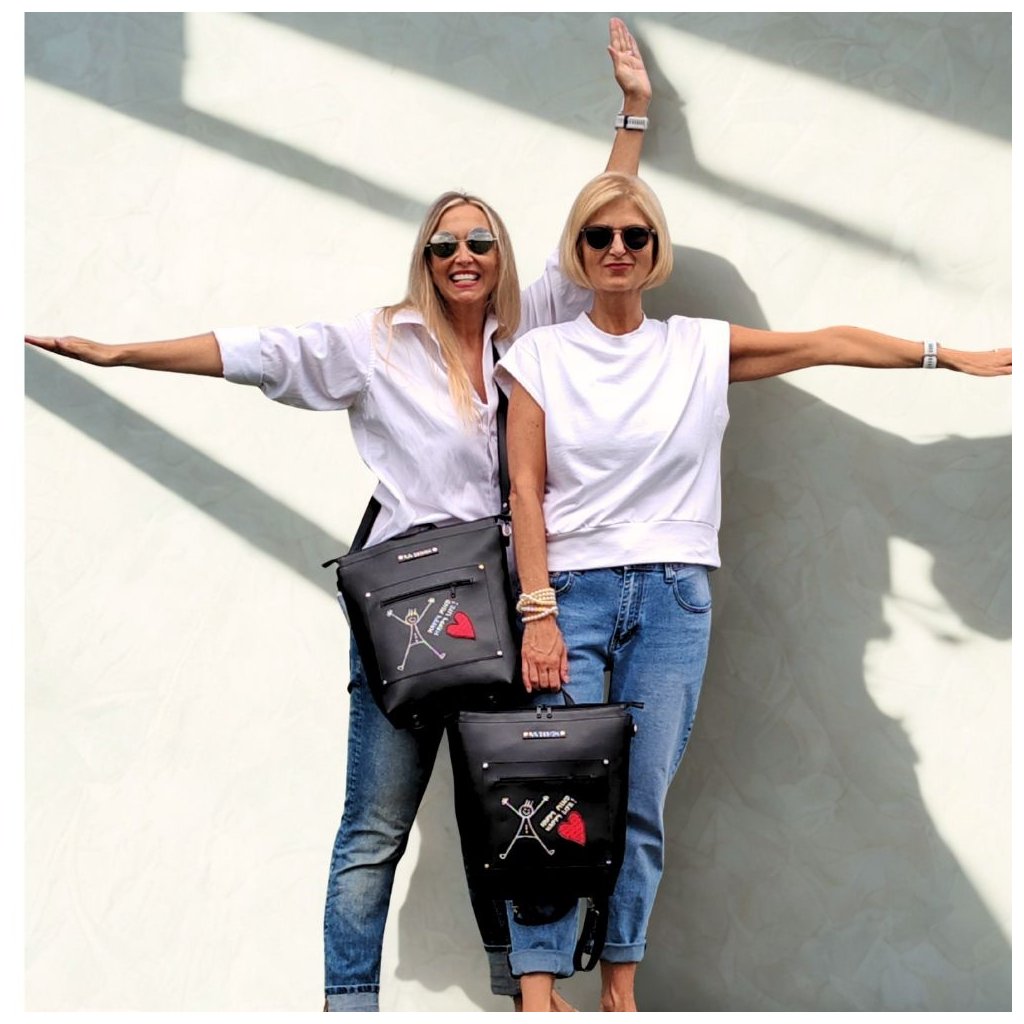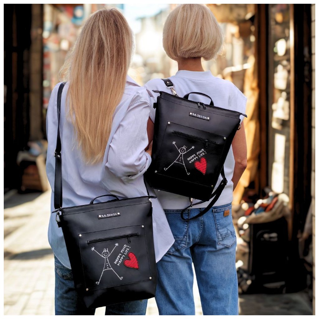 Batoh a kabelka v jednom z odolné syntetické usně. Vejde se formát A4, možnost přidat crossbody popruh.