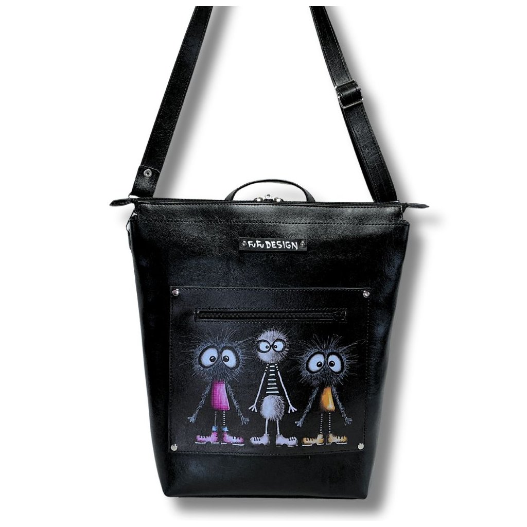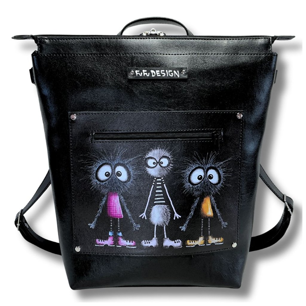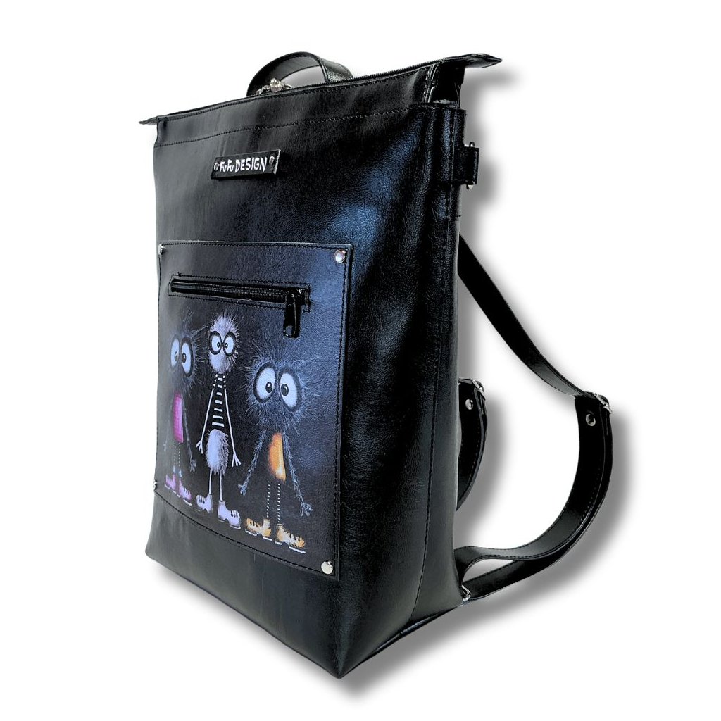 Batoh a kabelka v jednom z odolné syntetické usně. Vejde se formát A4, možnost přidat crossbody popruh.