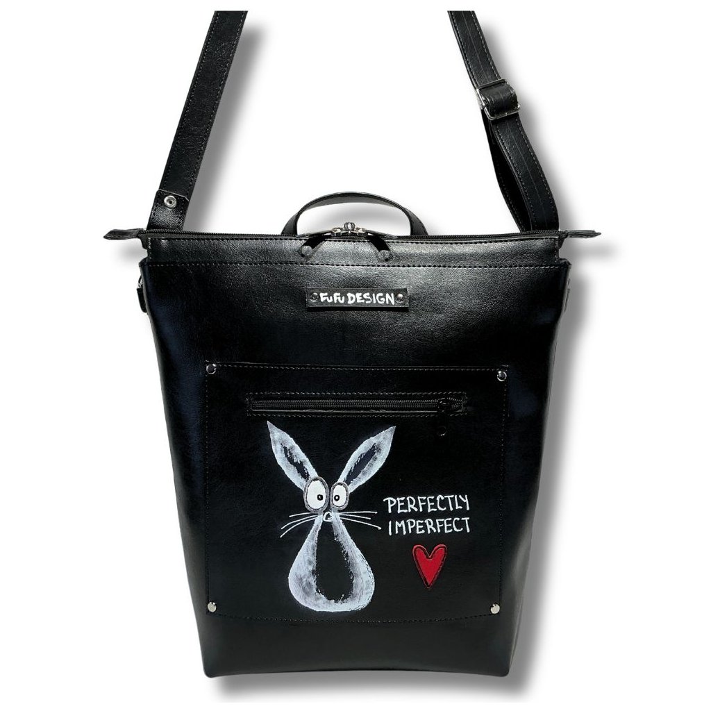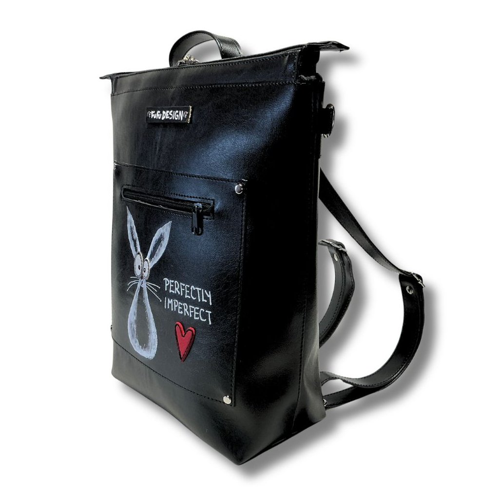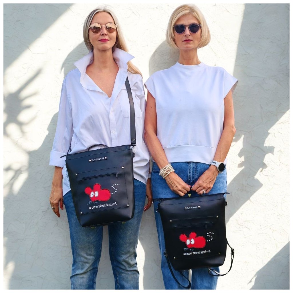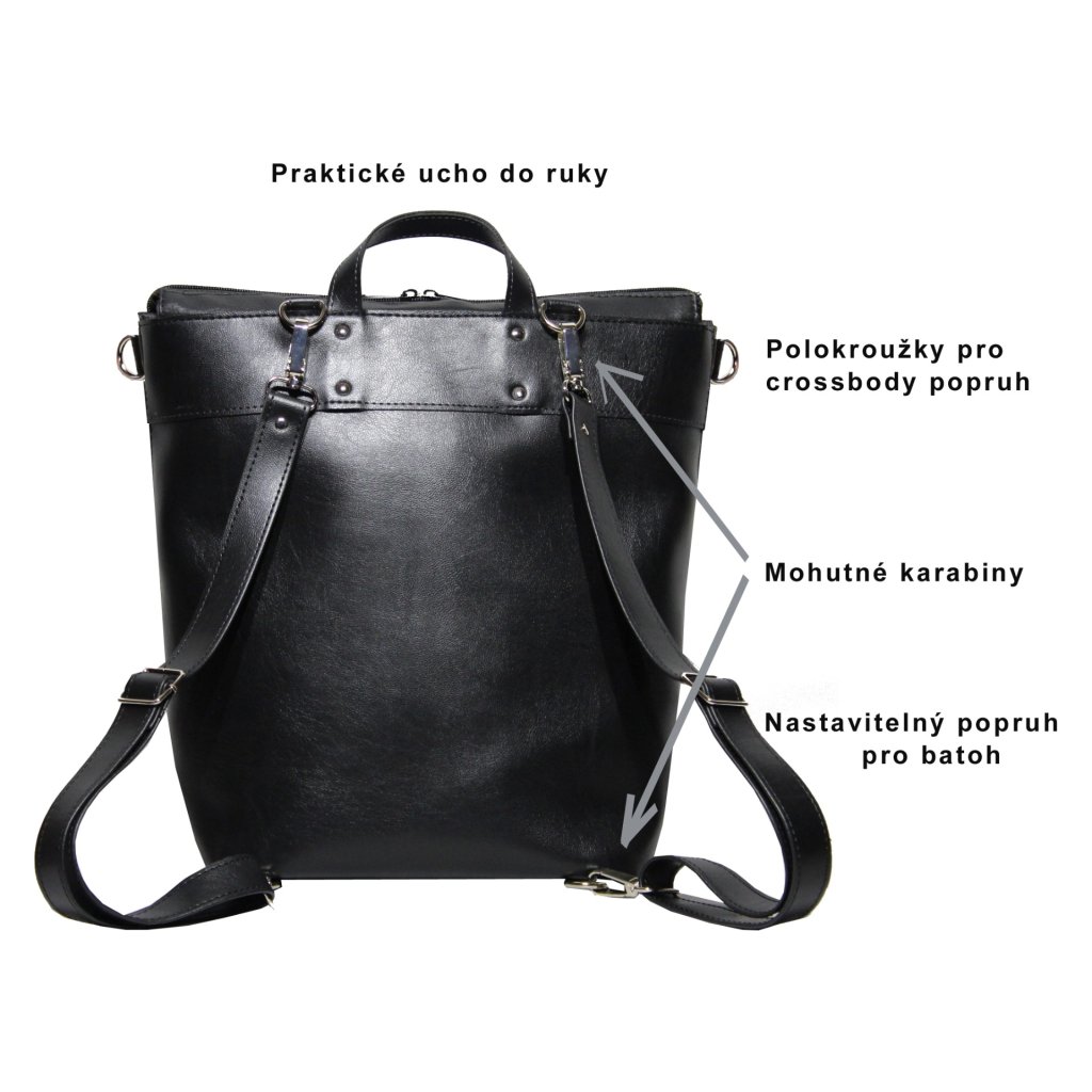 Batoh a kabelka v jednom z odolné syntetické usně. Vejde se formát A4, možnost přidat crossbody popruh.