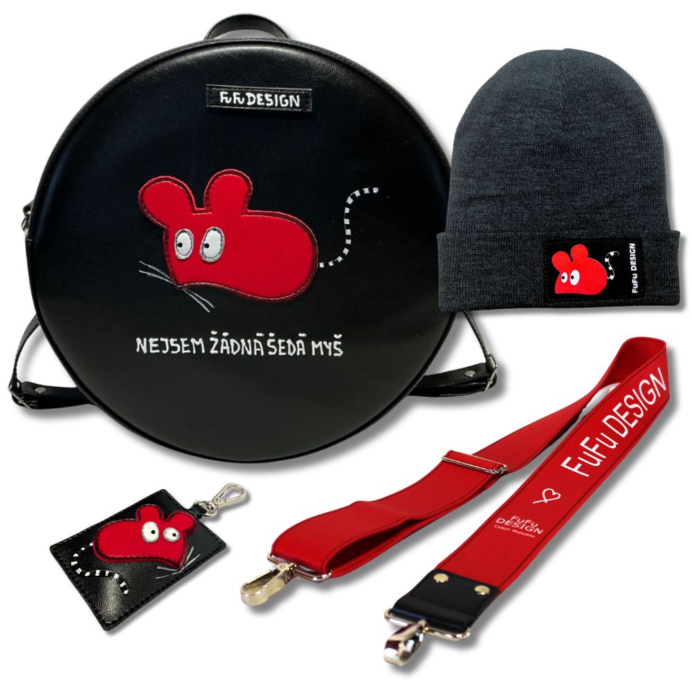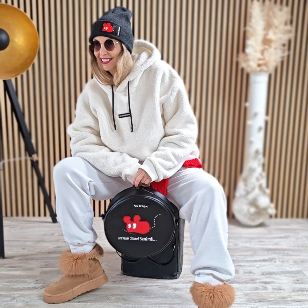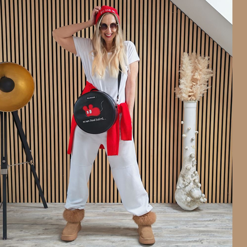 Černý kruh, který si klidně vezme hlavní roli. Kulatá batohokabelka mluví jasně: nejsem žádná šedá myš. Vyměnitelné popruhy jí dávají náladu – klidně i tenhle červený. FuFu čepice drží outfit pohromadě a nepustí ho do nudy. Hravé, sebevědomé, lehce drzé. Styl, který si nehraje na trend – je originál.