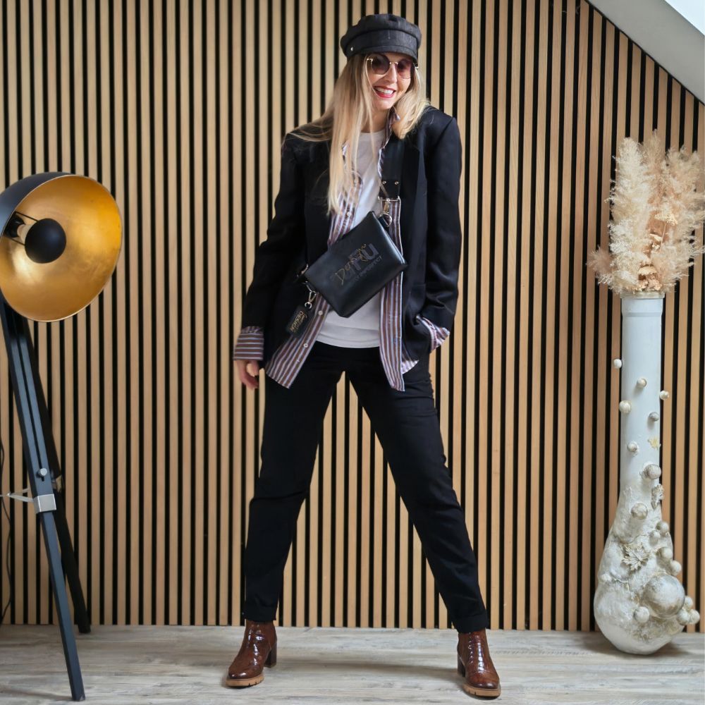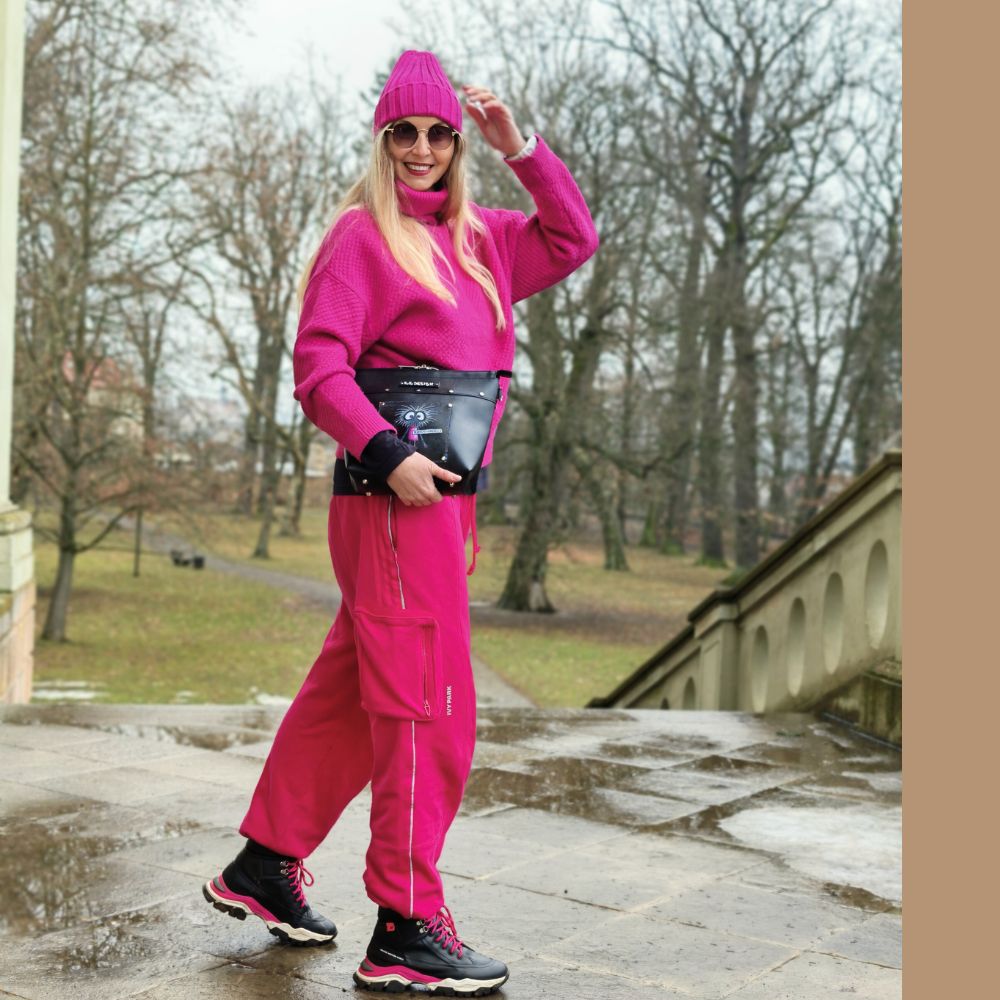 Kraví mobilkasi bere hlavní slovo a vůbec se za to nestydí. Kraví boty potvrzují, že detail je tady víc než trend. FuFu čepice to celé drží v klidu a stylu. Ležérní, sebevědomé, trochu drzé – přesně tak, jak to máme rády. Outfit, který říká: originalita není náhoda.