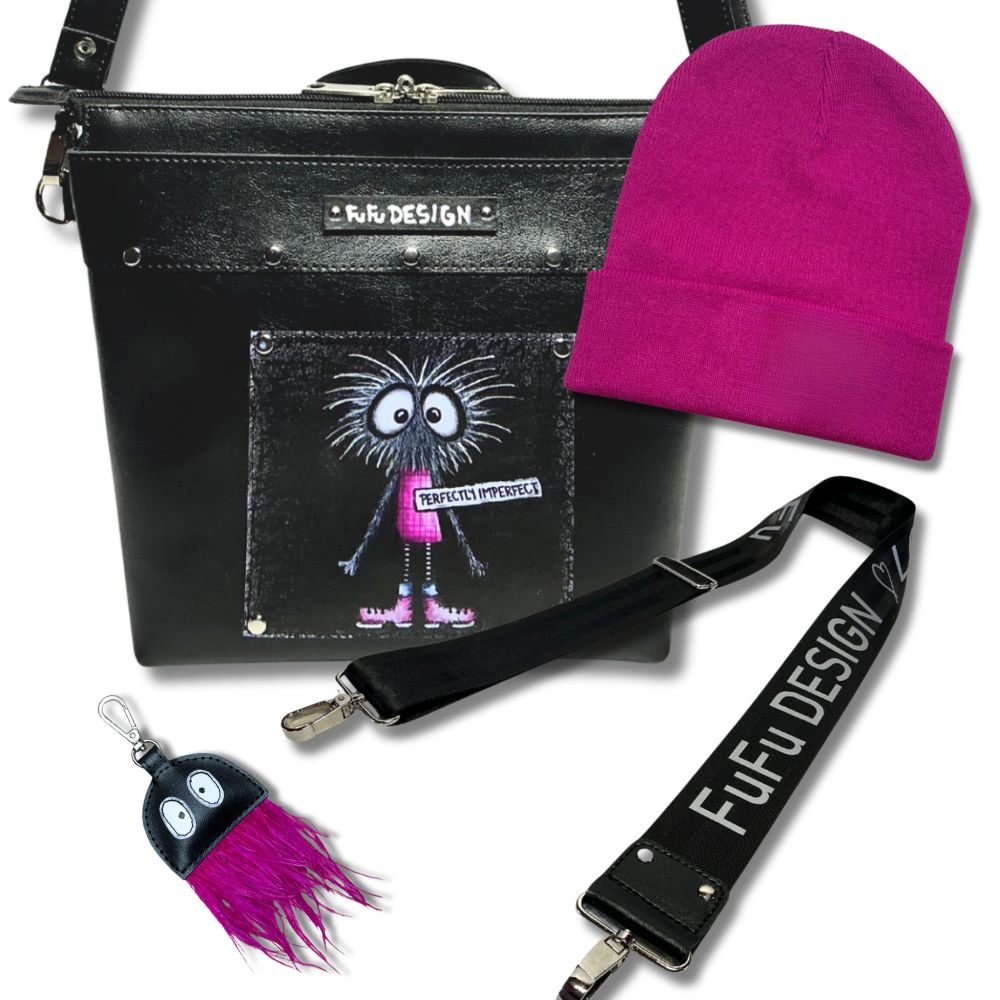 Černý základ, který si nechá líbit klidně trochu drzosti. Božan se hlásí o slovo a je mu úplně jedno, jestli je dokonale učesaný. Střední crossbody kabelka drží tempo s městem, ale styl má pořád po svém. Růžové detaily nejsou roztomilé – jsou sebevědomé. Popruh FuFu DESIGN dává jasně najevo, že tohle není tichý doplněk. Ležérní, výrazná, dokonale nedokonalá – přesně taková, jaké to máme rády.