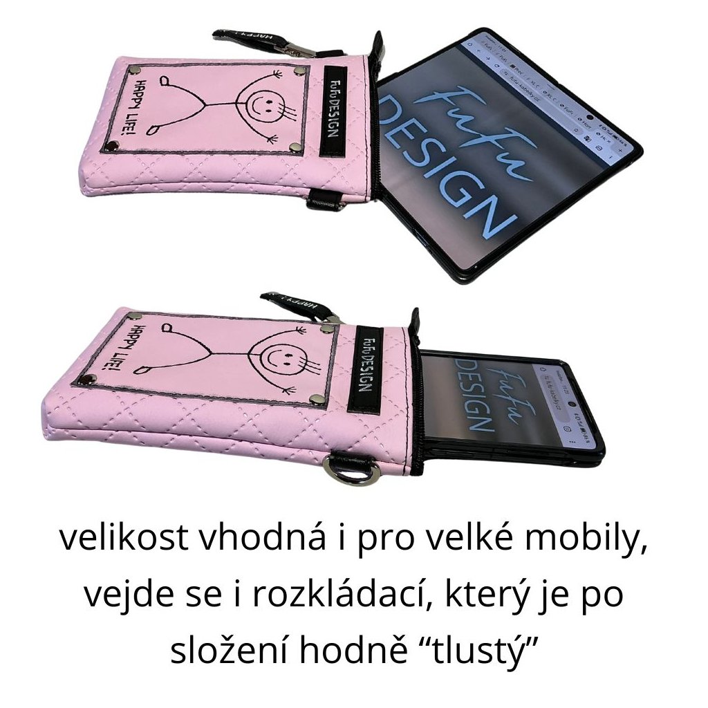 Mobilka – kabelka z měkké eko-kůže nejen na mobil, ale i na další drobnosti - klíče či peníze. Popruh je odepínací, takže kabelku bez popruhu můžete využít i jako obal na mobil.