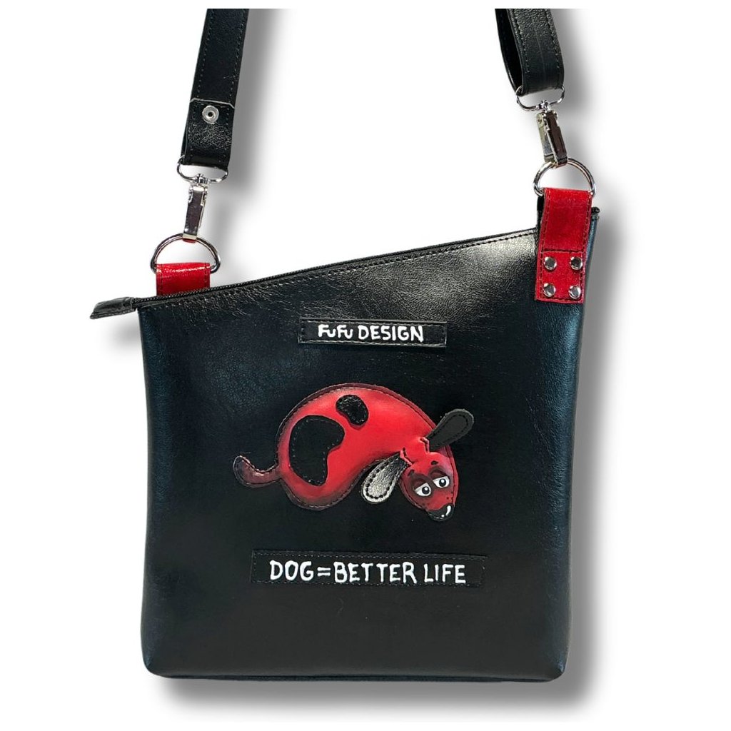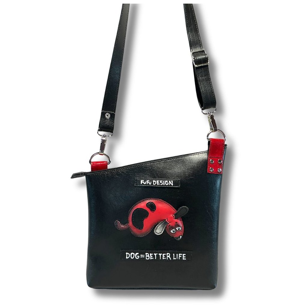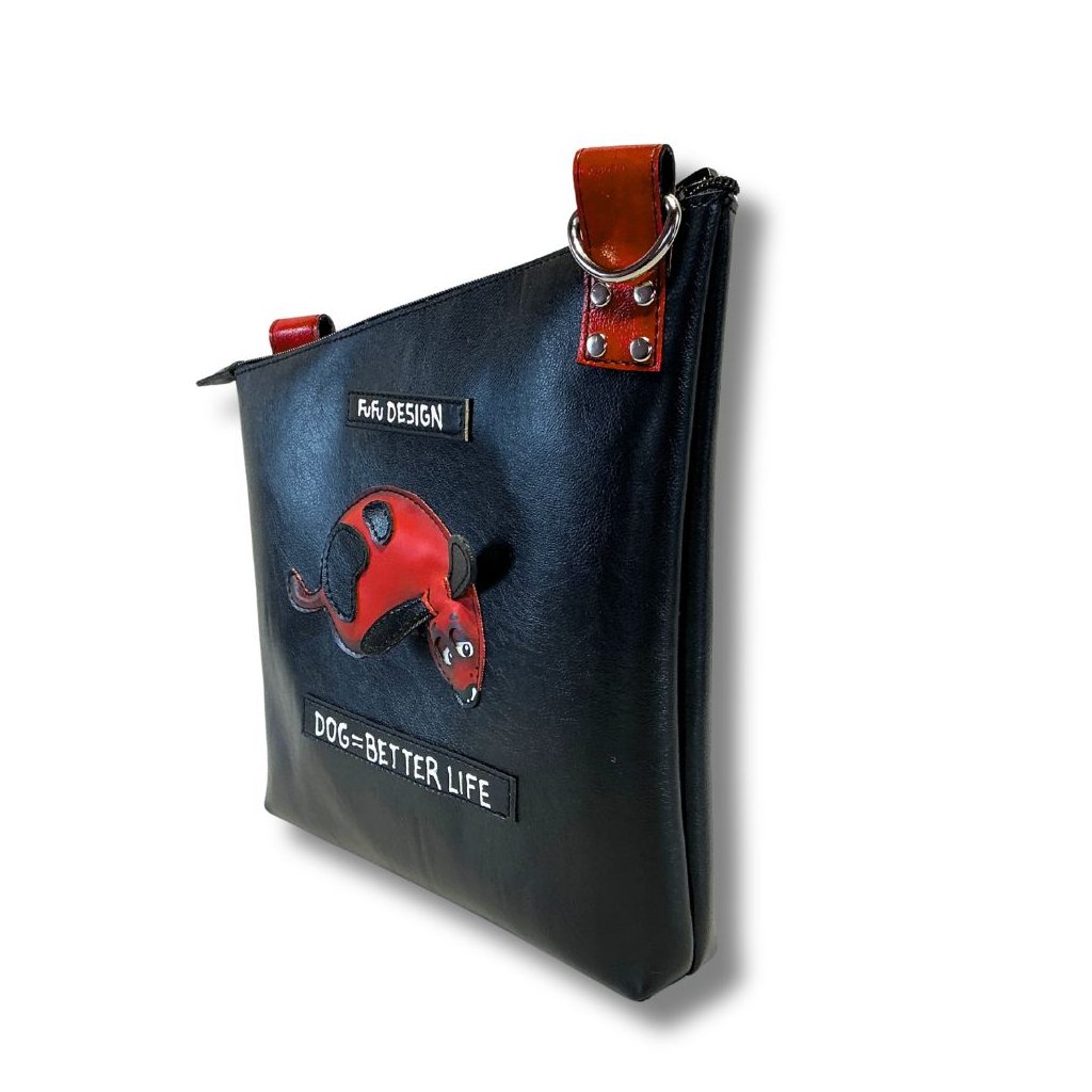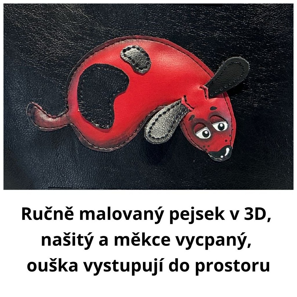 Ručně malovaný pejsek na speciální ekokůži, pejsek je našitý na kabelce, měkce vycpaný s oušky do prostoru – díky tomu vytváří výrazný 3D efekt.