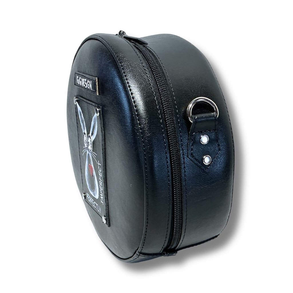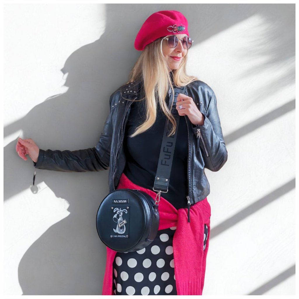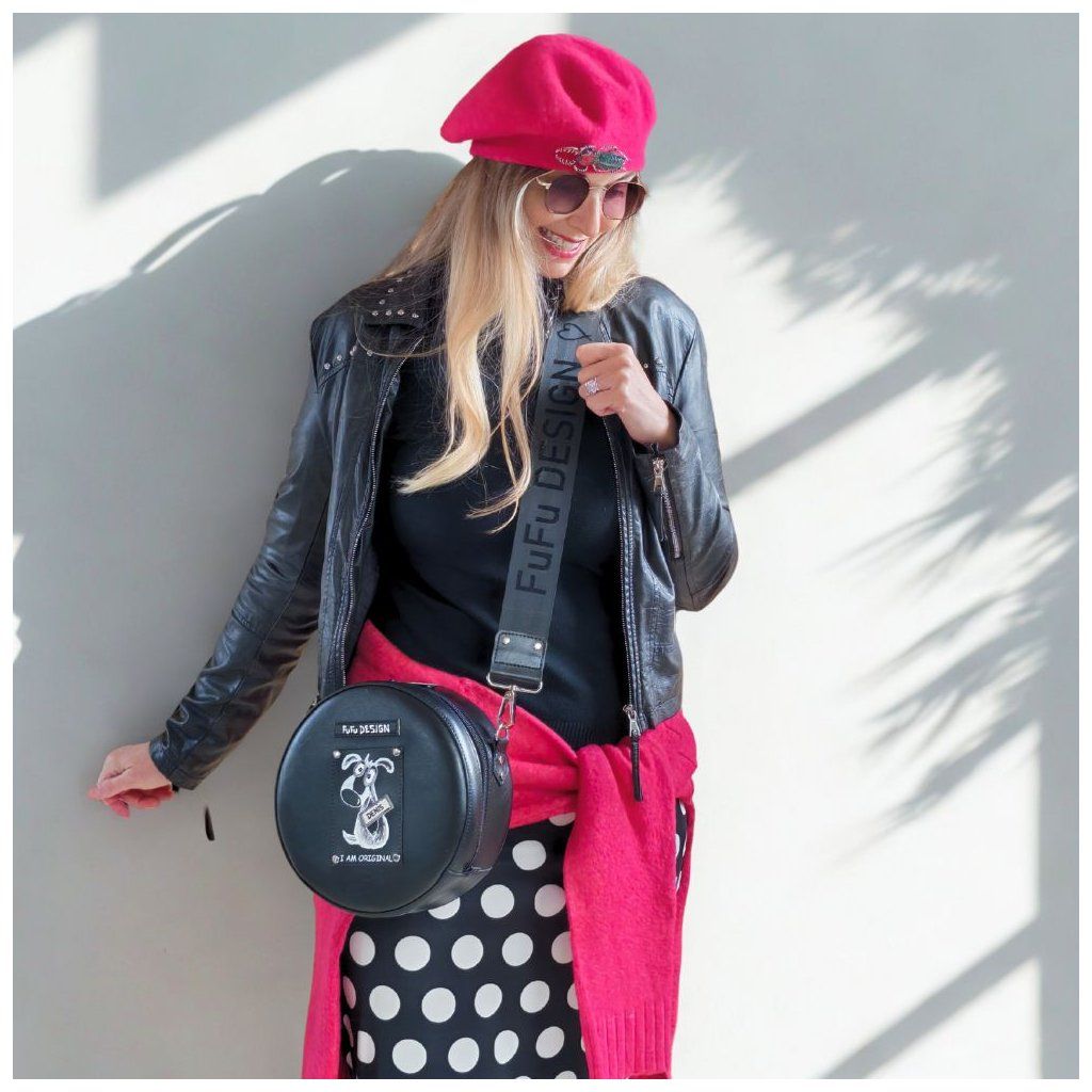 Crossbody kabelka s nastavitelným černým popruhem, který lze odepnout. Kabelku lze nosit na rameni nebo crossbody. Kabelka má zip po obvodu a dá se plně otevřít, takže se do ni skvěle "leze". Díky širokému bočnímu dílu je velmi prostorná. Kvalitní syntetická useň připomínající pravou kůži, skvěle drží kulatý tvar a neošoupe se, neodře se ani opravdu dlouhodobým nošením, stále bude vypadat jako nová.