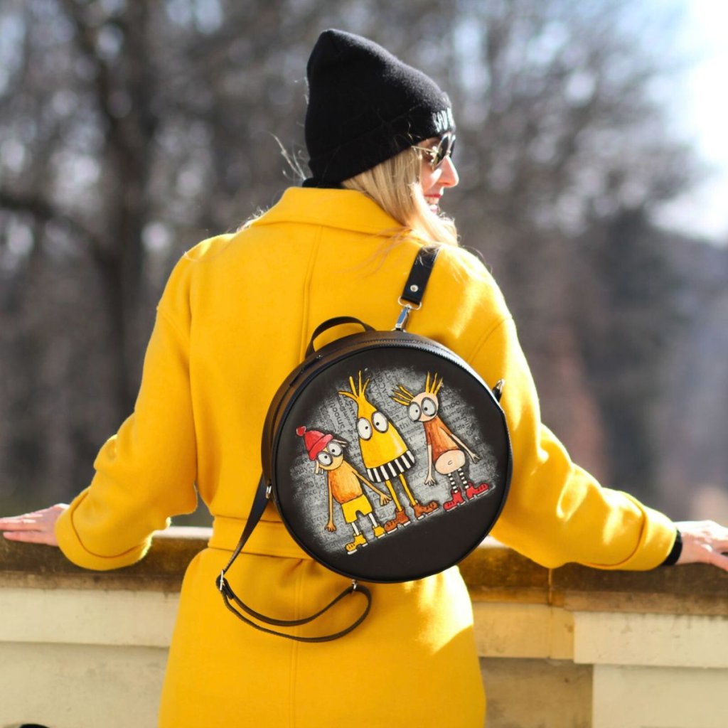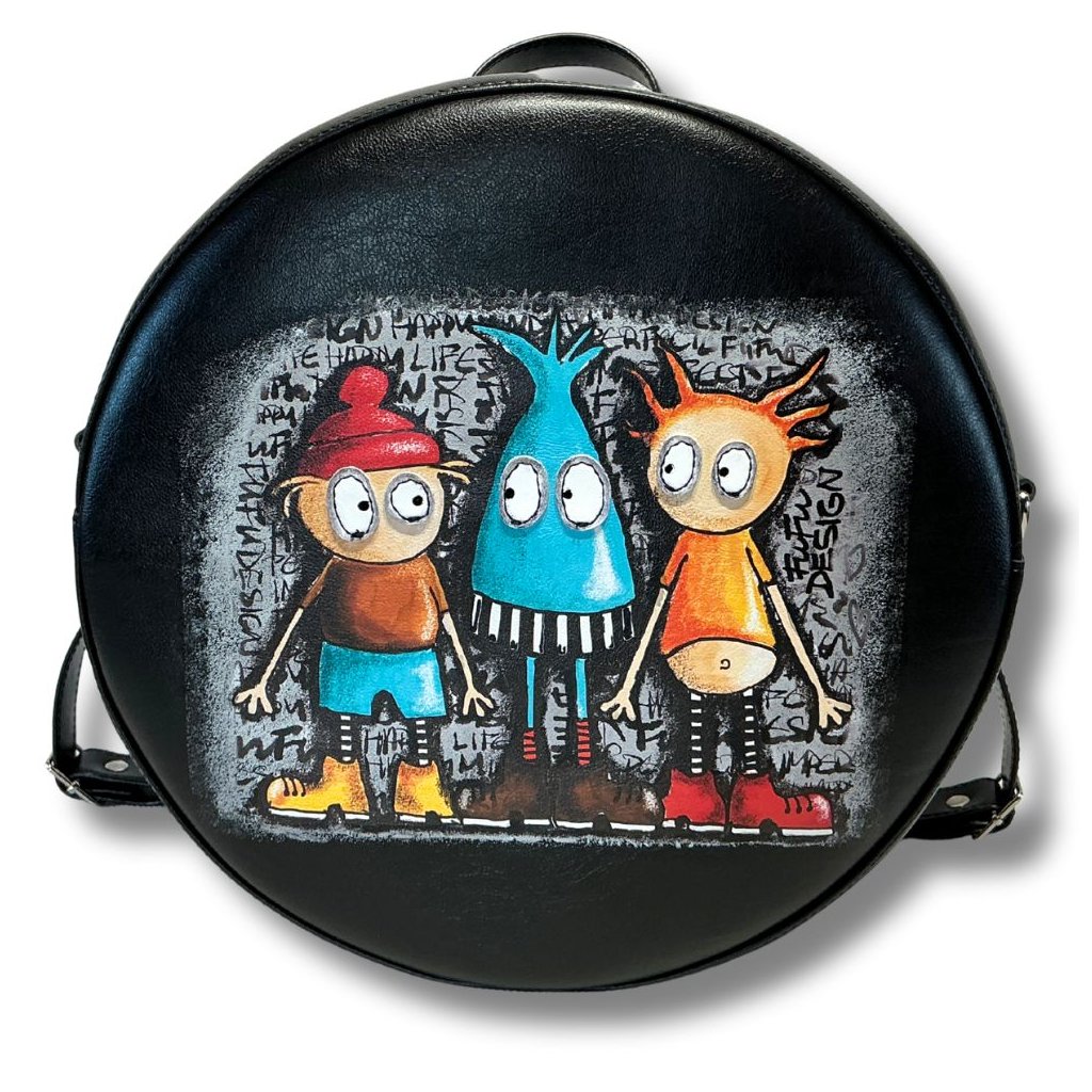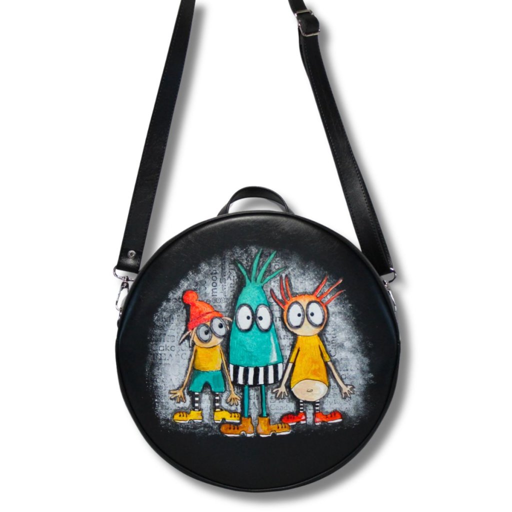 Kulatý Batoh a kabelka v jednom. Ručně malované, vyrobeno z odolné syntetické usně. Možnost přidat crossbody popruh.