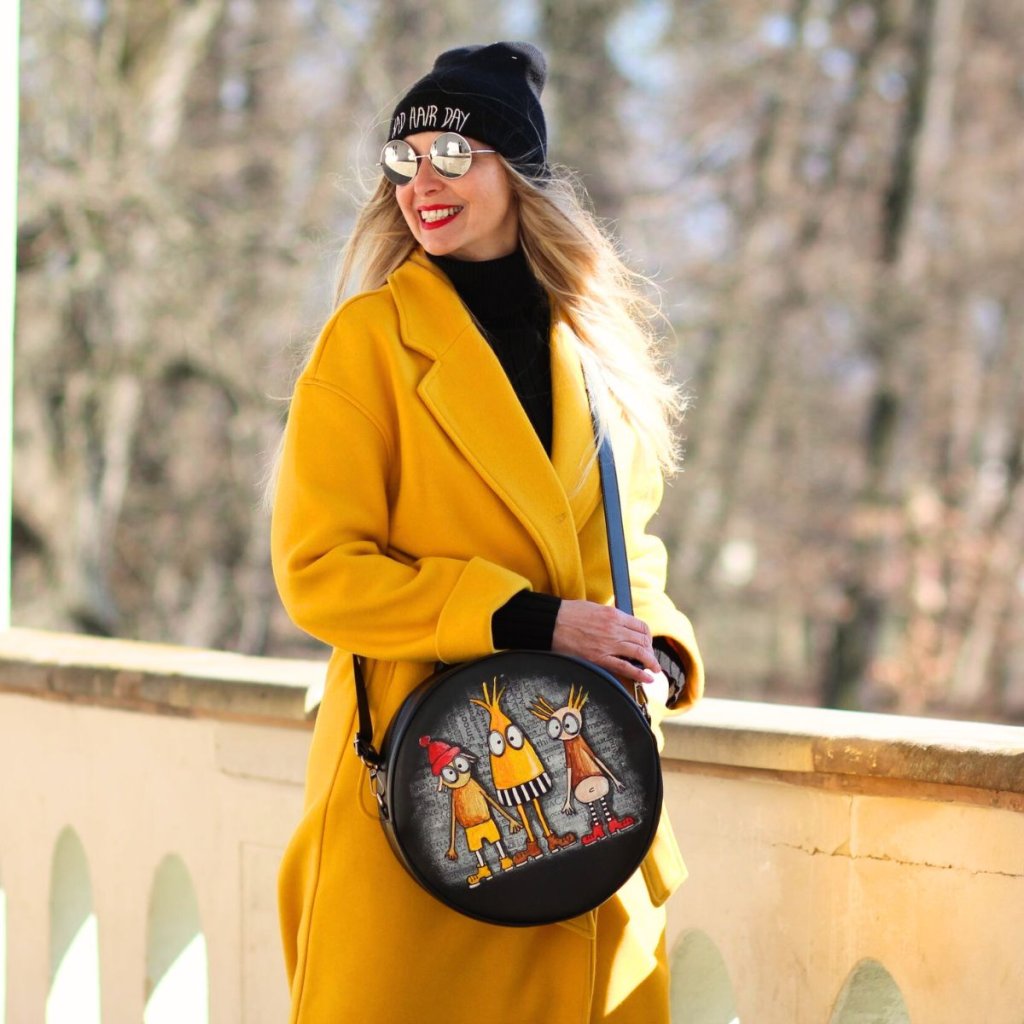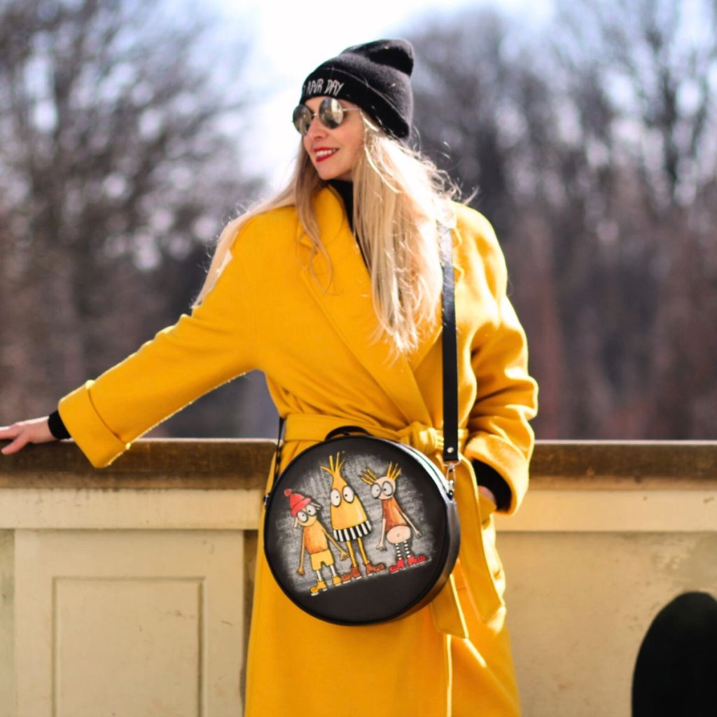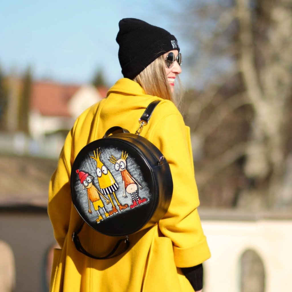 Kulatý Batoh a kabelka v jednom. Ručně malované, vyrobeno z odolné syntetické usně. Možnost přidat crossbody popruh.
