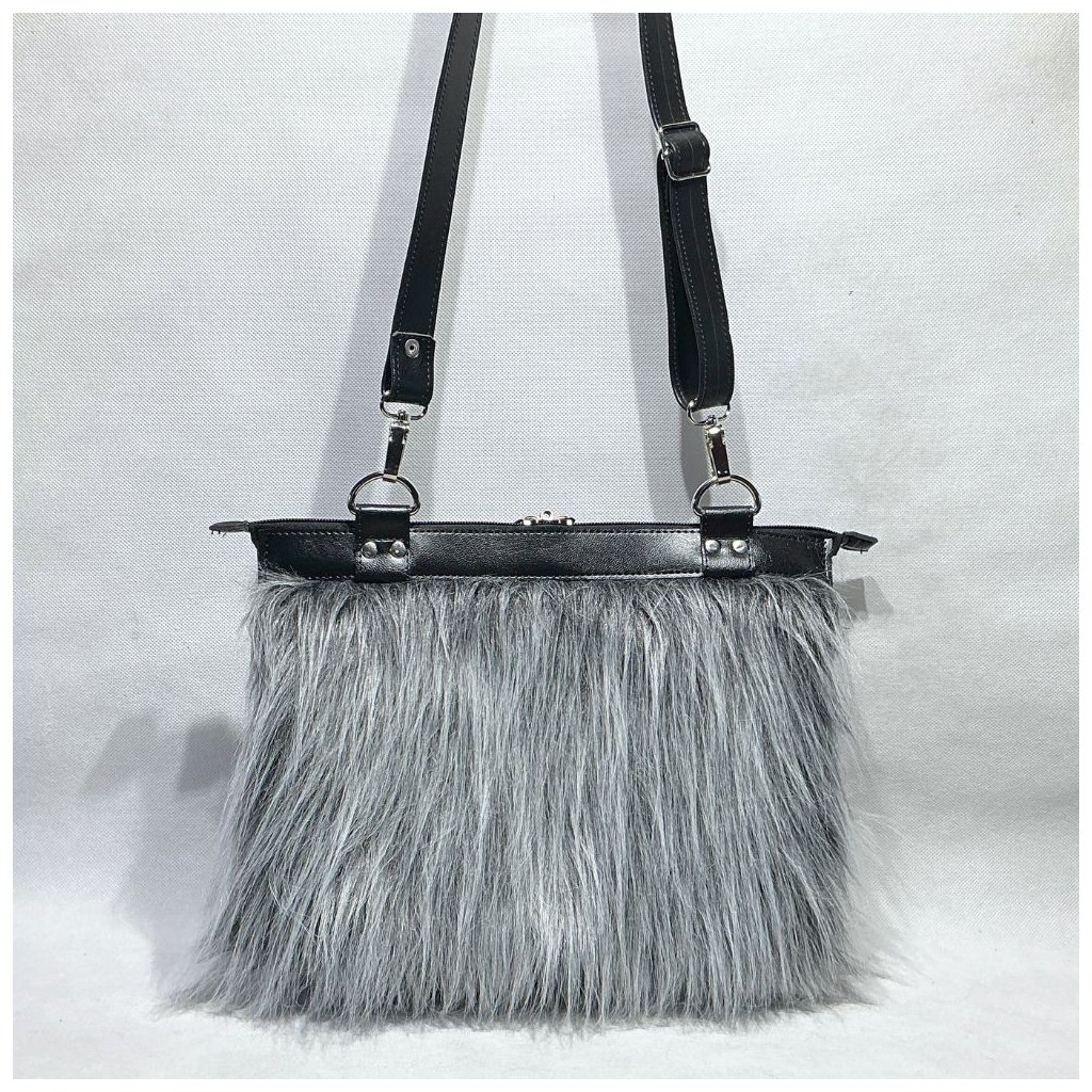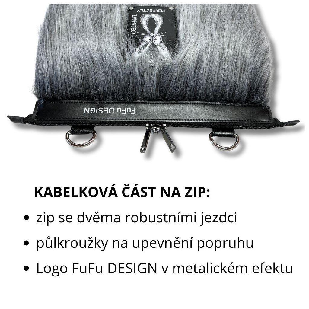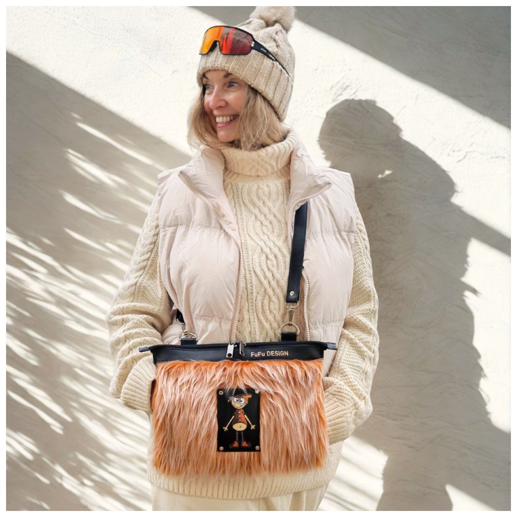 Zvenku luxusní umělá kožešina, shora vstup na zip do prostorné kabelkové části. Z boku je samostatný rukávník s měkkým fleecem. Kabelková část je velmi prostorná, vypodšívkovaná prošívanou podšívkou a uvnitř má kapsu na zip.