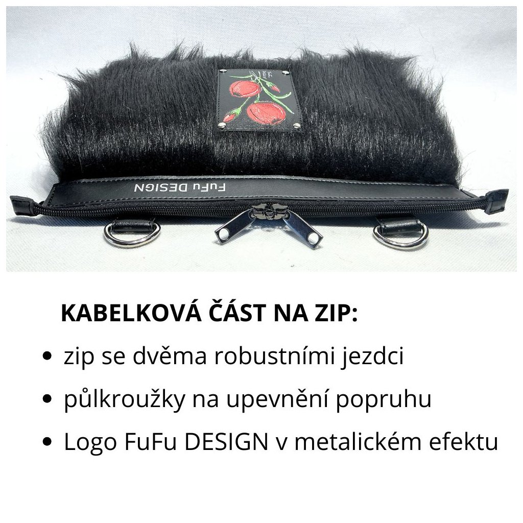 Zvenku luxusní umělá kožešina, shora vstup na zip do prostorné kabelkové části. Z boku je samostatný rukávník s měkkým fleecem. Kabelková část je velmi prostorná, vypodšívkovaná prošívanou podšívkou a uvnitř má kapsu na zip.