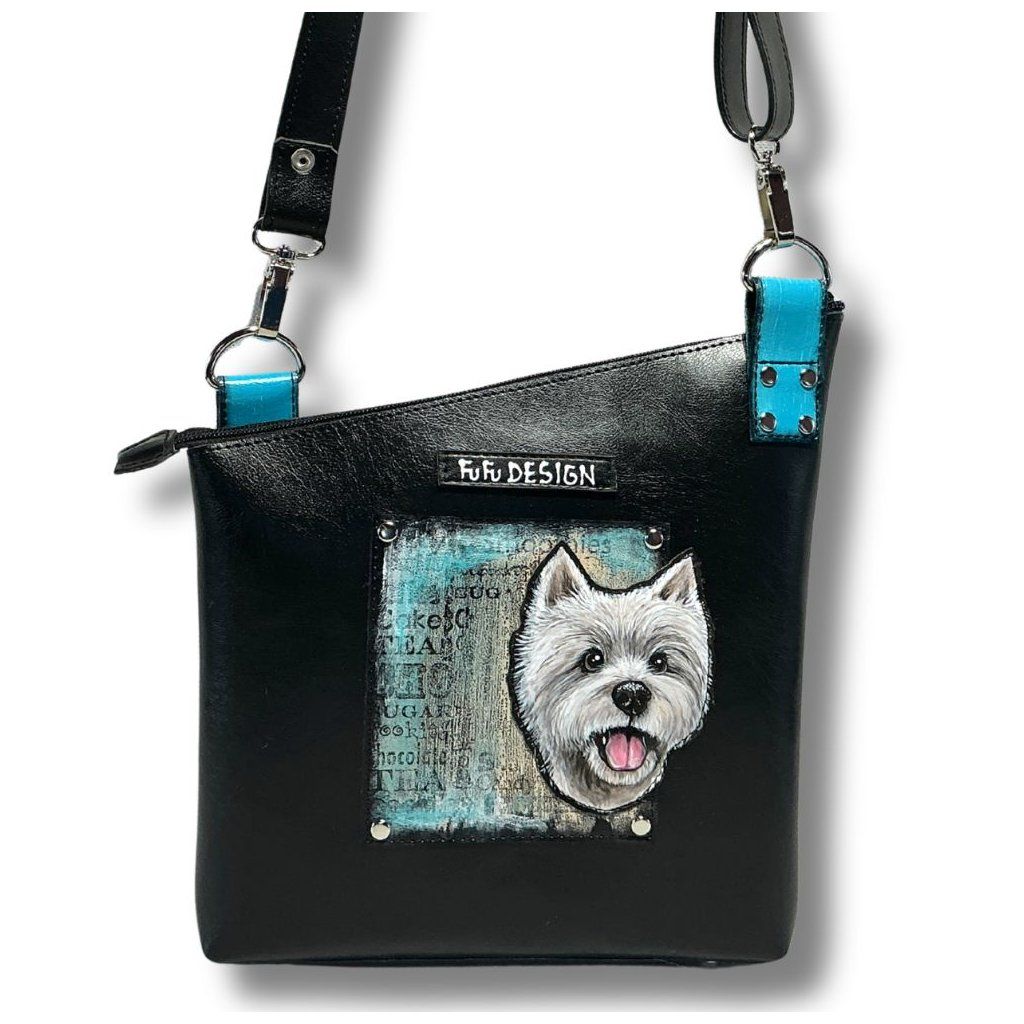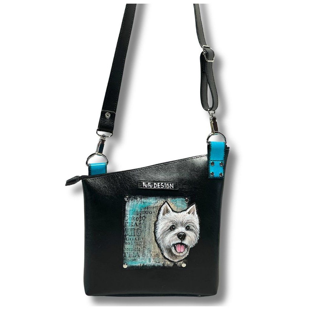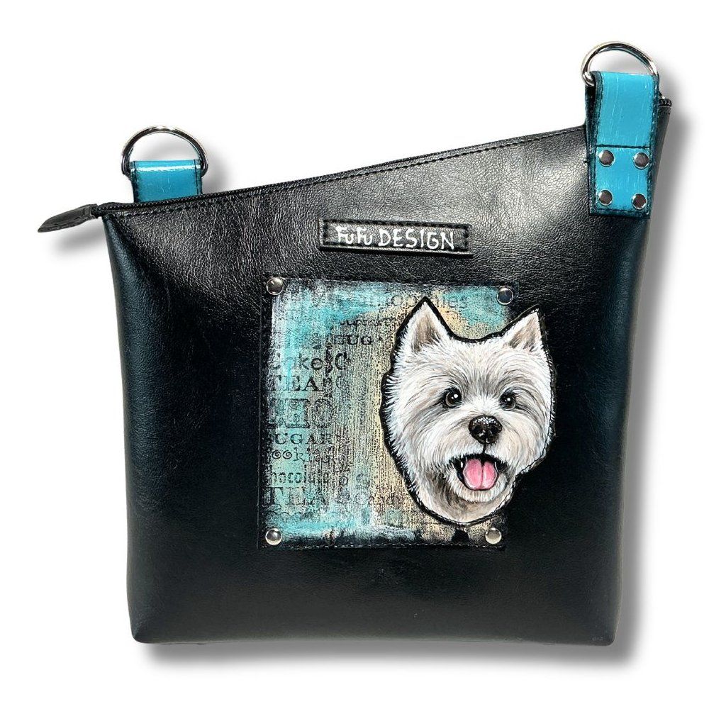 Ručně malovaný pejsek na speciální ekokůži, pejsek je našitý na kabelce a měkce vycpaný – díky tomu vystupuje do prostoru a vytváří výrazný 3D efekt.