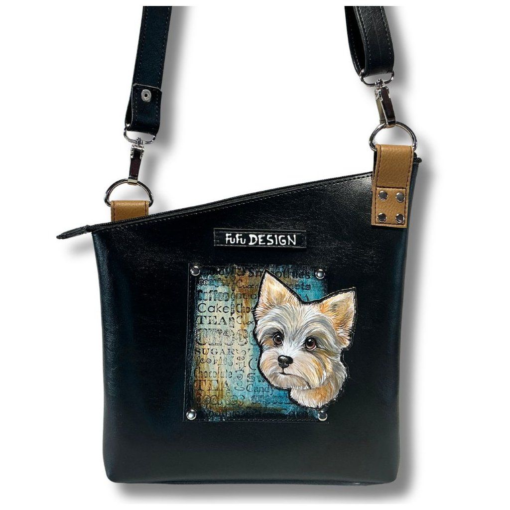 Ručně malovaný pejsek na speciální ekokůži, pejsek je našitý na kabelce a měkce vycpaný – díky tomu vystupuje do prostoru a vytváří výrazný 3D efekt.