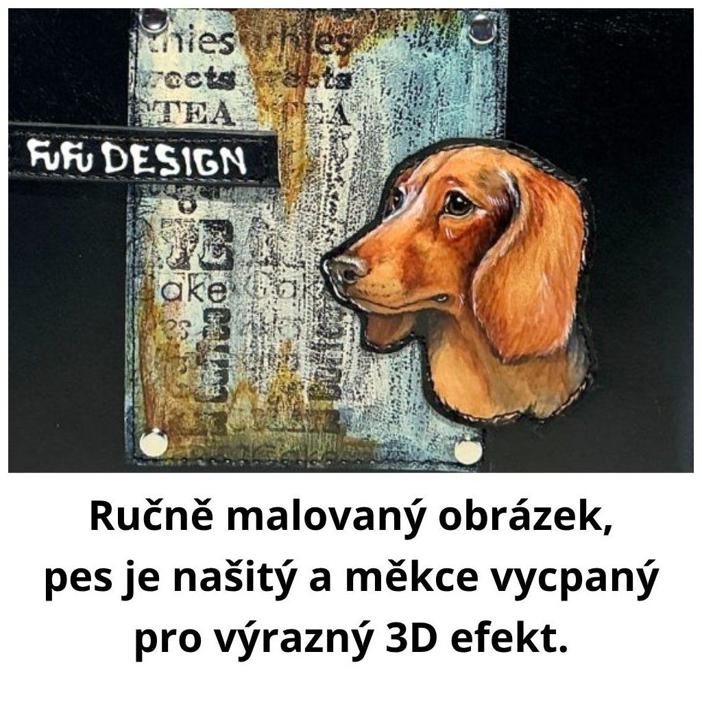 Ručně malovaný pejsek na speciální ekokůži, pejsek je našitý na kabelce a měkce vycpaný – díky tomu vystupuje do prostoru a vytváří výrazný 3D efekt.