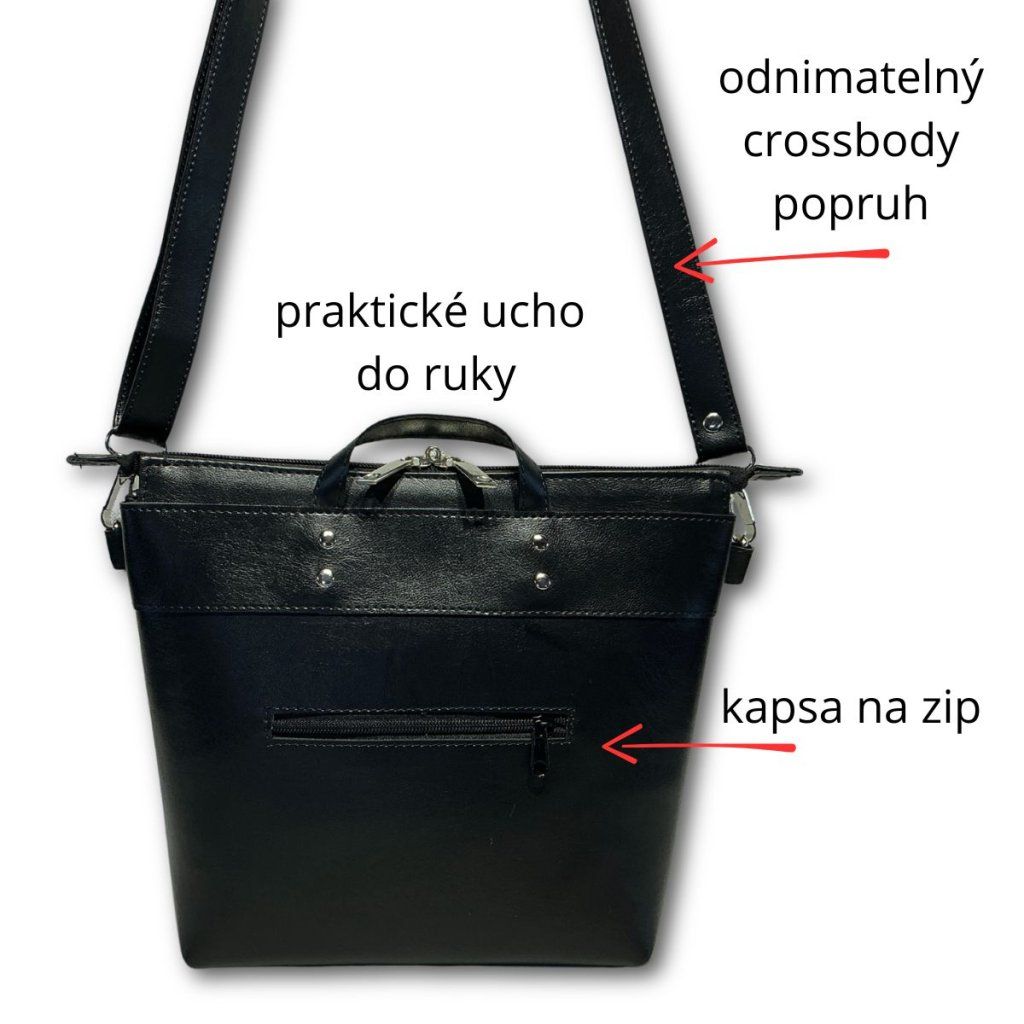 Crossbody kabelka s širokým dnem a nastavitelným černým popruhem, který lze odepnout. Kabelku lze nosit na rameni, crossbody nebo v ruce (má malé ouško do ruky). Velmi kvalitní syntetická useň připomínající pravou kůži, skvěle drží tvar a neošoupe se, neodře se ani opravdu dlouhodobým nošením, stále bude vypadat jako nová.